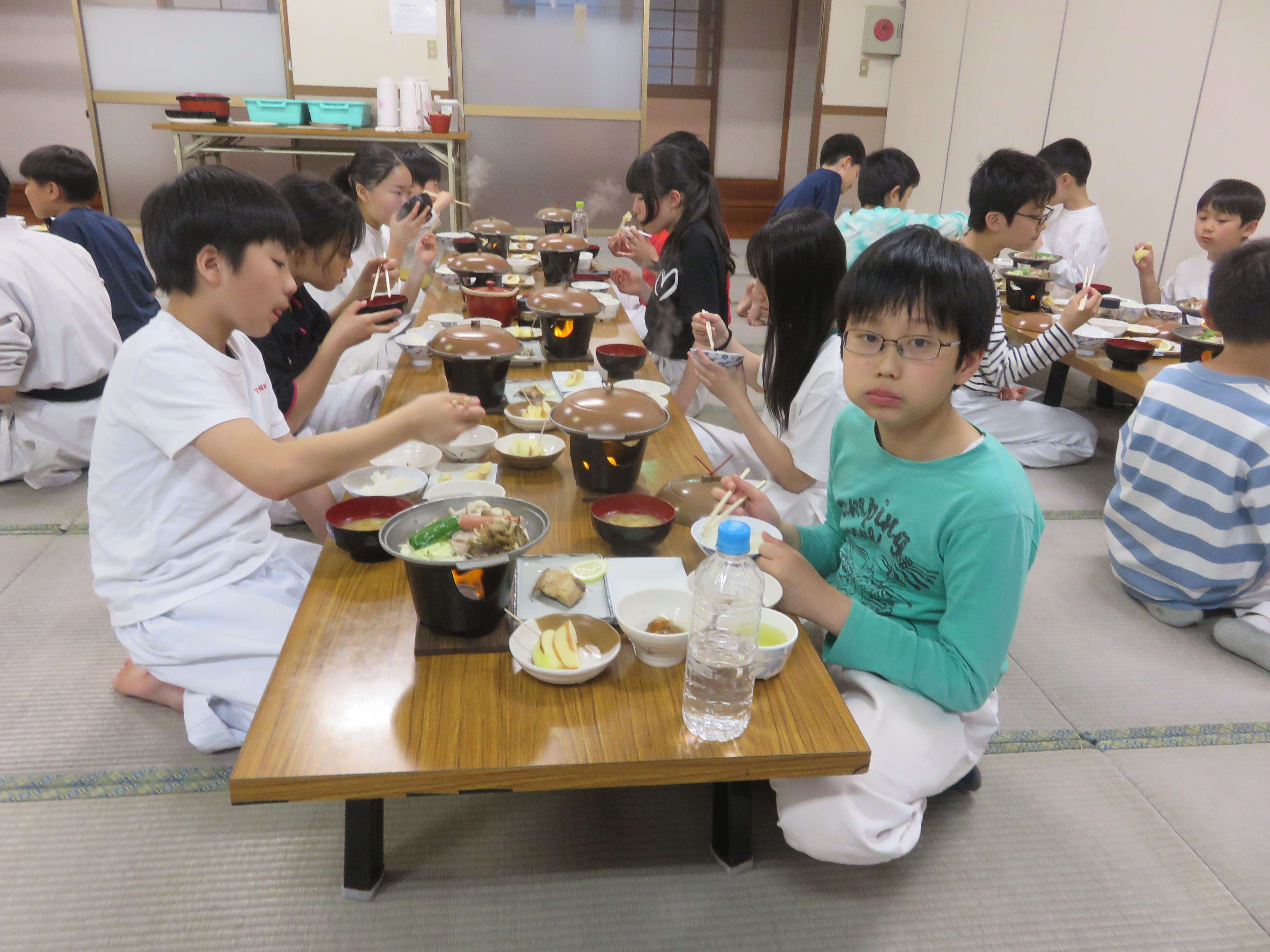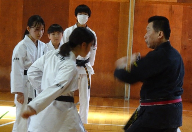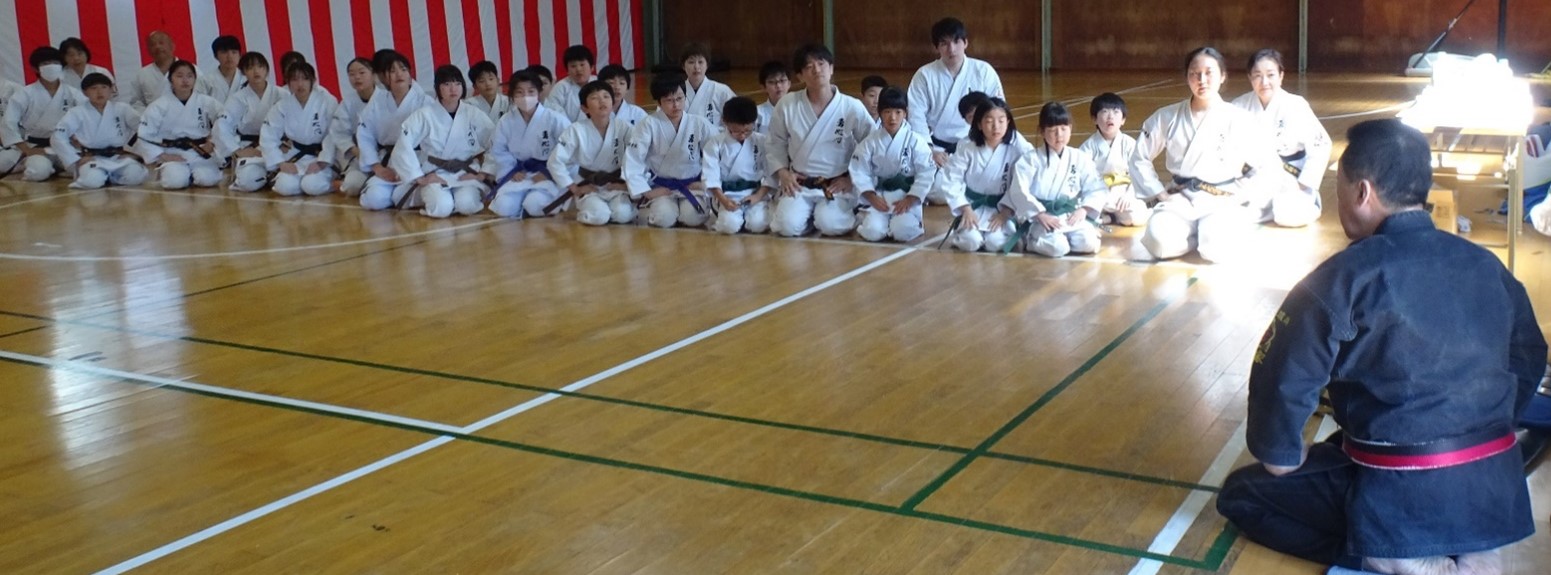 今回の合宿では、帯別、男女別、年齢別により、容・約束組手・組手・古武道(棒術・釼術)・居合・武家舞等と、細やかなご指導をして頂きました。また、一般のみならず中高生が色帯の小学生に教える場面も多くあり、”教える”稽古の場でもあり、より多くを学んだ実りの多いものとなりました。